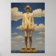 A surreal and stylish depiction of a man in a vintage-inspired beach outfit, featuring a yellow and white striped blazer with matching shorts, a striped turtleneck, sunglasses, and a wide-brimmed hat. The scene is set against a vibrant blue sky filled with fluffy clouds, evoking a nostalgic summer aesthetic. The artistic composition combines elements of surrealism and hyperrealism, making it a visually captivating and fashion-forward image.