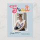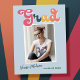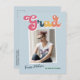 Trendy retro photo, graduation announcement postcards, featuring design elements of vintage style typography reading "Grad" in boho colours of the rainbow. The graduates photo is highlighted with thin white boarders. Light sky blue background colour or easily edit and change the colour as needed. The back of the card offers personalised text spaces for information about your graduation. Perfect for the high school, college and university grad.
