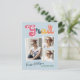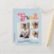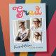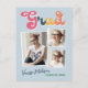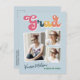 Trendy retro 3 photo collage, graduation announcement postcards, featuring design elements of vintage style typography reading "Grad" in boho colours of the rainbow. The graduates photos are highlighted with thin white boarders. Light sky blue background colour or easily edit and change the colour as needed. The back of the card offers personalised text spaces for information about your graduation. Perfect for the high school, college and university grad.