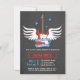 This stylish, trendy and cool baby shower invitation has a flaming red electric guitar with a pair of white wings behind it. The banner wrapped around the guitar reads "Rock a Bye Baby Shower" which is an amusing pun twist to a classic baby lullaby. Dark grey background has a light texture design to it. On the reverse is a classic vinyl record with musical notes and stars for decorations. This invitation is perfect for any rock and roll, music or rock star theme baby shower celebration! Personalise easily with your baby shower details.