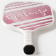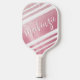 Sporty but girly personalized rose gold glitter pickleball paddle featuring a name or monogram shown in an editable hand-lettered script typography and changeable white sporty stripes for the pickler or pickleball enthusiast. PADDLE OPTIONS: Choose from Black, Tan or White edging and grip colors on the ordering page. ASSISTANCE: For help with design modification or personalization, color change, transferring the design to another product or if you would like coordinating items, contact the designer BEFORE ORDERING via the Zazzle Chat MESSAGE tab below or email makeitaboutyoustore@gmail.com.