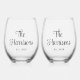 Chic monogram wedding 2 stemless wine glass set with your married last name in a stylish signature script and your wedding date in simple modern typography.