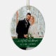 Elegant Stylish Trendy Script Our First Christmas Wedding Photo Green Ornament with Snowflakes back