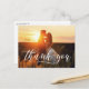 Stylish wedding thank you post card template featuring a photo on the front and back, "Thank You" in a modern white script calligraphy script, and custom thank you message.