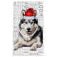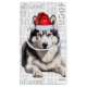 A festive and stylish Siberian Husky is wearing a red Santa hat, all ready to wish happy holidays to any dog lover or pet lover who adores huskies and sits on a Woof word art background.