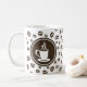© Sunny Mars Designs. Tall Steaming Cup of Coffee with Coffee Beans Mug - Trendy coffee mug featuring a cute tall mug of coffee and saucers with steam coming out of it and coffee beans pattern background vector illustration.