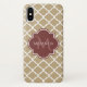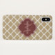 A stylish tan Moroccan quatrefoil pattern Barely There iPhone X Case with a burgundy coloured badge you can personalise by adding your name and monogram initial to. This is part of the Warm Sand and Spiced Apple Spring Quatrefoil Collection.