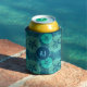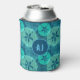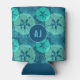 Stylish beachy can cooler printed with teal blue and aqua sand dollars and sea shells over an ocean blue background. There's a customisable monogram area front and back for you to add your own initials