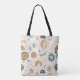 This stylish tote bag features a white background and black handles. The bag is decorated with various abstract and geometric patterns in shades of blue, orange, and beige. The patterns include shapes such as suns, moons, rainbows, circles, triangles, and lines, creating a whimsical and artistic design. Ideal for everyday use, shopping, or as a thoughtful gift for friends and family, this tote bag combines functionality with a unique touch of art.