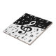 A stylish and eye-catching pattern of random musical notes in black and white with a large treble clef in the centre. The bottom of the design features black music notes on a white background with the top featuring white music notes on a black background. The large clef changes from black to white in colour half way.