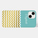 This beautiful case features an elegant chevron pattern in shades of aqua, turquoise colour with gold and white, with a customisable name in stylish typography. The case is made of durable, impact-resistant plastic, with a slim profile that fits easily in your pocket or purse. It offers easy access to all buttons and ports, and it's compatible with wireless charging. Protect your phone in style with this custom case!