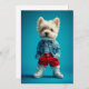 This charming image features a West Highland White Terrier dressed to impress in a light blue denim jacket, a white t-shirt, vibrant red shorts, and white sneakers. Set against a clean blue background, this stylish pup exudes personality and charm, making it a delightful and heartwarming sight for fashion and dog lovers alike.