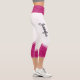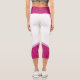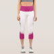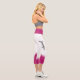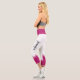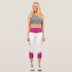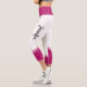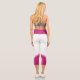 These white modern workout leggings feature an elegant and delicate white floral design on a dark magenta background on the waistband and on the legs.