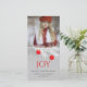 Lovely Christmas photo card done in a vertical look, with the picture area, on the top half of the card. The bottom half of the card is decorated with graphics of a white pine branch with red ornaments against a grey background with silver tone glitter look accent. Joy in large red text and custom dark grey text below that, is ready to personalise. Model photo courtesy of Lori Lang.
