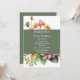 Pretty bridal shower invitation done in white, with colourful wildflowers. A moss green band, runs across the centre, of the invitation, and serves as the text area. Personalise the custom white text to suit your event needs.