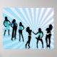 Bring dynamic style to your wall with this vibrant poster featuring the sexy disco party girls silhouette graphic. The stunning black silhouettes of women pop dramatically against the light blue sunburst background. Perfect for decorating a bedroom, dorm room, home studio, or office. This high-quality print showcases the stylish divas vector art, making it a great piece of modern graphic art for dance and retro enthusiasts. Brighten any space with this cool, eye-catching clubbing night design poster.