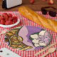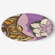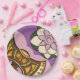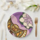 This artwork features a stylized axe and a flower, each rendered in a flat, geometric style with bold outlines. The axe has an ornate design with a brown handle and a yellow and brown head, decorated with circles and lines. The flower has light purple petals and a yellow center, with a few green leaves. The background is a solid purple color, and the axe and flower are placed asymmetrically. The overall design is decorative and eye-catching, combining elements of nature (the flower) and human craft (the axe) in a stylized and somewhat abstract manner. The contrast between the sharp, angular axe and the soft, rounded flower creates visual interest.