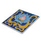 A square tile with a blue background features a stylized lotus flower in the center, with yellow ribbons framing the flower on either side. The lotus has blue outer petals, a yellow middle section, and a pink center with white tips. The ribbons are thick and curved, with a white outline. The tile has a glossy finish and a slightly raised texture.
