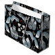 Seamless pattern of stylized blue foxes with intricate floral designs on black. Red accents and white flowers create a whimsical, mystical vibe.