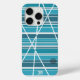 Abstract design in aqua blue colours featuring varying coloured stripes and circles.This design also features a subtle monogram at the bottom of the case
