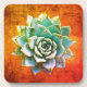 An aqua succulent with a hint of lavender is framed by a fiery background of rusty orange. These coasters would make a lovely gift for a succulent lover, gardener or someone with southwest decor.