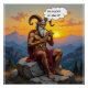 A mythological Satyr with large curved horns is depicted wondering whether to suck or play the object in a mountainous landscape at sunset.