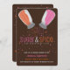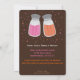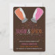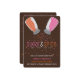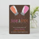 This adorable baby shower party invitation has the theme of Sugar and Spice! The design has two salt shakers, one orange to represent spice and one pink to represent sweet. They're shaking out cute little flakes and hearts over the words "Sugar and Spice". The background is a chocolate brown. These invites are fun and cute and sure to represent a baby shower! Your guests will love it.