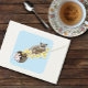 A cute sugar glider sitting on a tree branch with small yellow, pink and white flowers all around. The sugar glider and flowers are all drawn in a tattoo style in a backdrop of blue