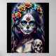 Step into a world where tradition meets artistry with this striking image of sugar skull makeup. Adorned with a vibrant floral crown, the subject embodies the festive spirit of Dia de los Muertos, showcasing a blend of cultural reverence and creative expression.