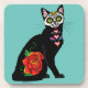A black cat with day of the dead sugar skull make-up on in a backdrop of teal