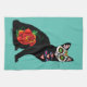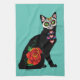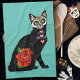 A black cat with day of the dead sugar skull make-up on in a backdrop of teal
