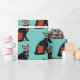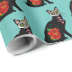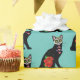 A black cat with day of the dead sugar skull make-up on in a backdrop of teal
