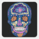 This square sticker features my tattoo style, colourful design of a sugar skull, on a black background, inspired by The Day of The Dead. The highly patterned skull has orange flowers in the eye sockets and a traditional design on the forehead. The colours are mainly orange blue pink and white.