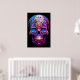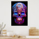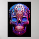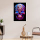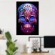 Sugar Skull image in blue and red, with a black background, on a wall poster.