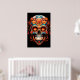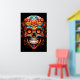 Sugar Skull design, in bright colors, including blue and orange, on a wall poster. Celebrate Day of the Dead, November 1-2.