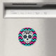 A sugar skull with black, hot pink, and turquoise accents on a chevron pattern background in matching colours. Shown here on a magnet.