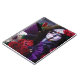 A fairy in a sugar skull day of the dead make-up wearing all purple surounded by red roses and skull