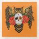 A brown great horned owl with a day of the dead sugar skull and red roses in a backdrop of orange.