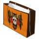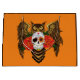A brown great horned owl with a day of the dead sugar skull with red roses in a backdrop of orange