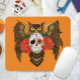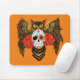 A brown great horned owl with a day of the dead sugar skull and red roses in a backdrop of orange.