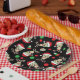 Christmas themed sugar skulls with Santa hats, peppermint eyes and candy cane crossbones. This design has a black background and the skulls are surrounded by Christmas candies.