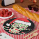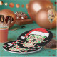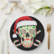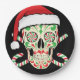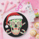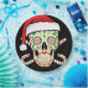 A Christmas themed sugar skull with a Santa hat, peppermint eyes and candy cane crossbones on a black background.
