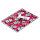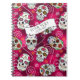 A colorful notebook design featuring a variety of decorative sugar skulls with flower and swirl accents on a textured-effect rose red background. The provided banner and text layer can be customized to your name or monogram using the provided template. Search ID725 to see other color choices and products with this fun pattern.