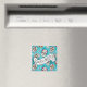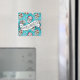 A colourful fridge magnet design for Day of the Dead festivities, featuring a variety of decorative sugar skulls with flower and swirl accents on a textured-effect turquoise blue background. The provided 'Feliz Dia de los Muertos' banner and text layer can be deleted to use this design for other occasions. Search ID725 to see other colour choices and products with this fun pattern.