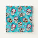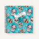 A colourful notebook design featuring a variety of decorative sugar skulls with flower and swirl accents on a textured-effect turquoise blue background. The provided banner and text layer can be customised to your name or other preferred text using the provided template. Search ID725 to see other colour choices and products with this fun pattern.