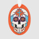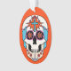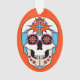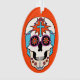 This graphic artwork features an illustrated sugar skull, or calavera, decorated with beads and flowers as well as a Christian cross on each forehead. This motif is commonly used during Day of the Dead celebrations or Dia de los Muertos, a Latin American holiday.
