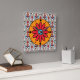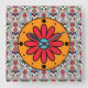 The graphic patterned artwork decorating this wall clock features an illustrated sugar skull, or calavera, decorated with beads and flowers as well as a Christian cross on each forehead. This motif is commonly used during Day of the Dead celebrations or Dia de los Muertos, a Latin American holiday.
