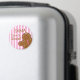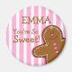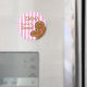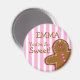 Customisable Christmas magnet with an adorable little gingerbread man with pink candy nose and buttons and white frosting. Pink and white striped background. Great stocking stuffer! Coordinated gift tags, note cards, postage stamps, stationery and mugs also available! PinkInkArt original!