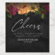 Lush floral arrangements in bright, warm colours ranging from coral and rose pink to golden yellow combine with vignetted, obsidian backgrounds to give the pieces in this elegant wedding suite a dark, moody ambience. This wedding wine label features abundant flowers, elegant calligraphy 'Cheers', your names, wedding date and a personal message. Search ID829 to see the complete collection.