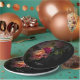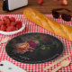 Lush floral arrangements in bright, warm colours ranging from coral and rose pink to golden yellow combine with vignetted, obsidian backgrounds to give the pieces in this elegant wedding suite a dark, moody ambience. This wedding paper plate features a side border of flowers, your names and wedding date. Search ID829 to see the complete collection.